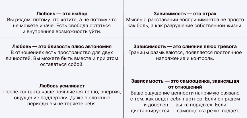 Поэтому сам факт, что вы боитесь потерять партнера, не означает зависимость. Разница появляется, когда страх начинает управлять вами. Когда вы рядом не потому, что хотите и выбираете, а потому что жизнь без этого человека кажется невыносимой.